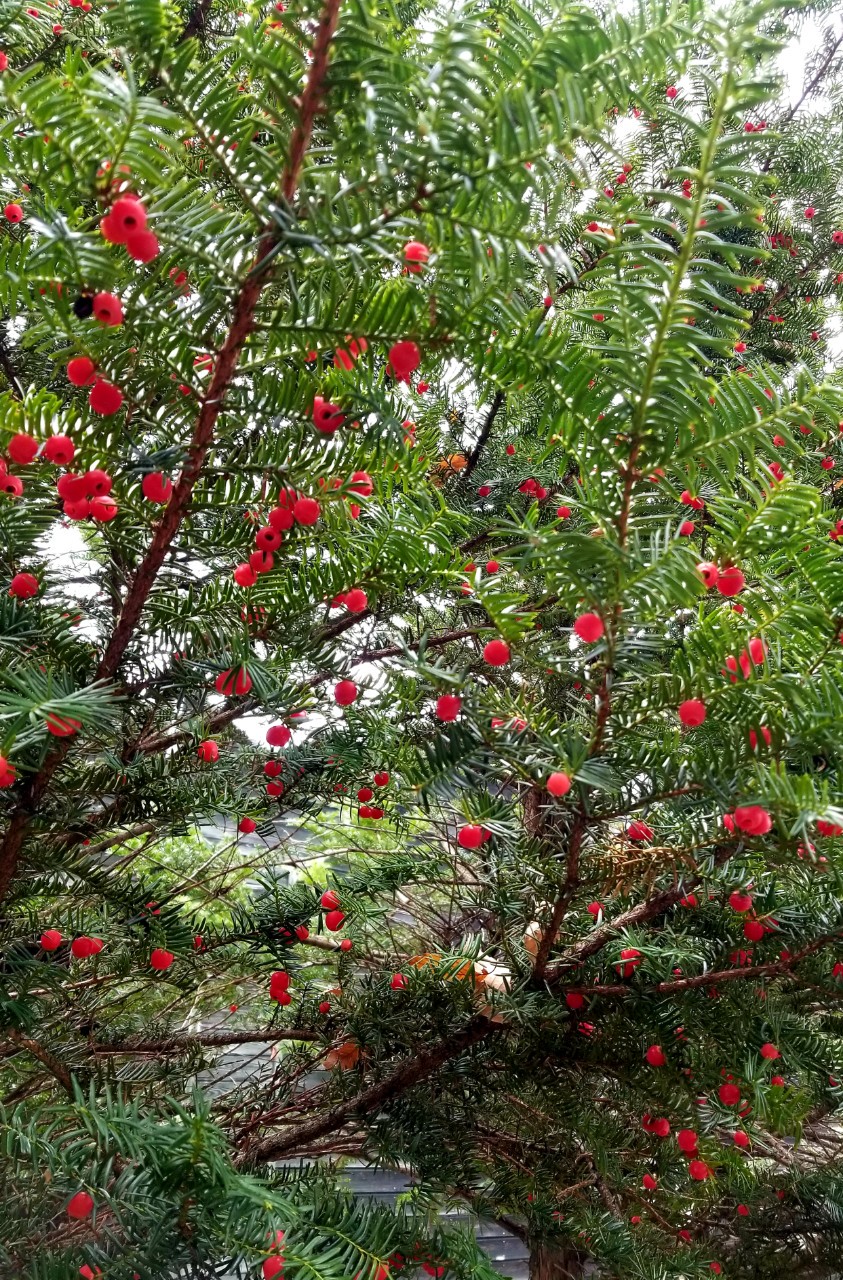そして18~19日と友人の別荘(軽井沢)に伺ってきました。庭園の紅葉も始まっていましたが、そこかしこに植えられていたモミの木と一位の木。大変珍しいのが、イチイの木が真っ赤な実を付けていたことです。一位は神主が使う笏(しゃく)の材料になる常緑樹。樹皮は赤褐色。小さい実は橙赤色で食べられるのです。その美しさに魅了されてパチリ。